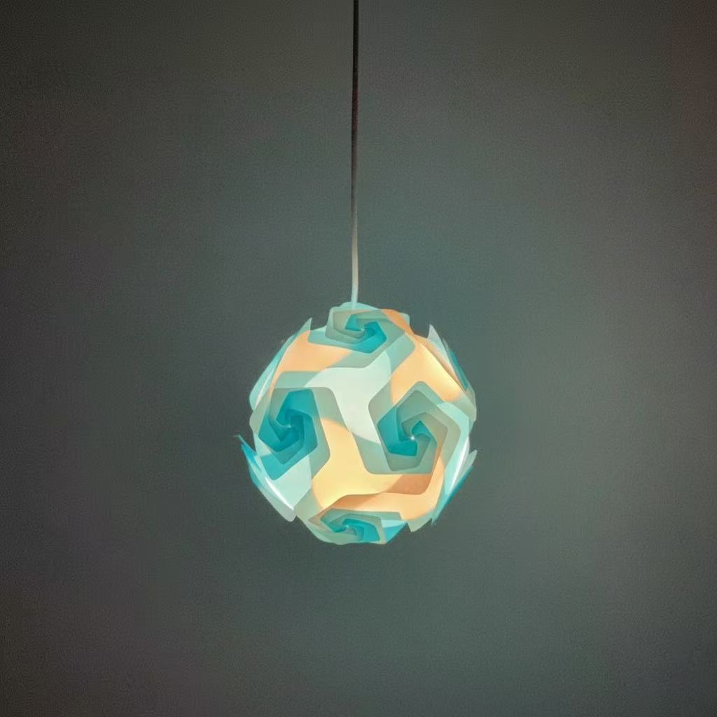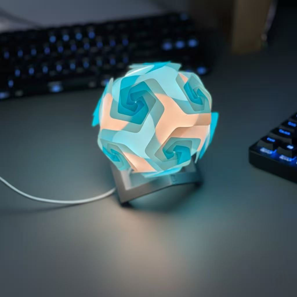 Illuminate your space with the Vortex Sphere, a stunning fusion of mathematics and modern design. Inspired by geometric tessellations, this lamp is constructed from interlocking spiral modules that weave together to form a perfect, glowing sphere.